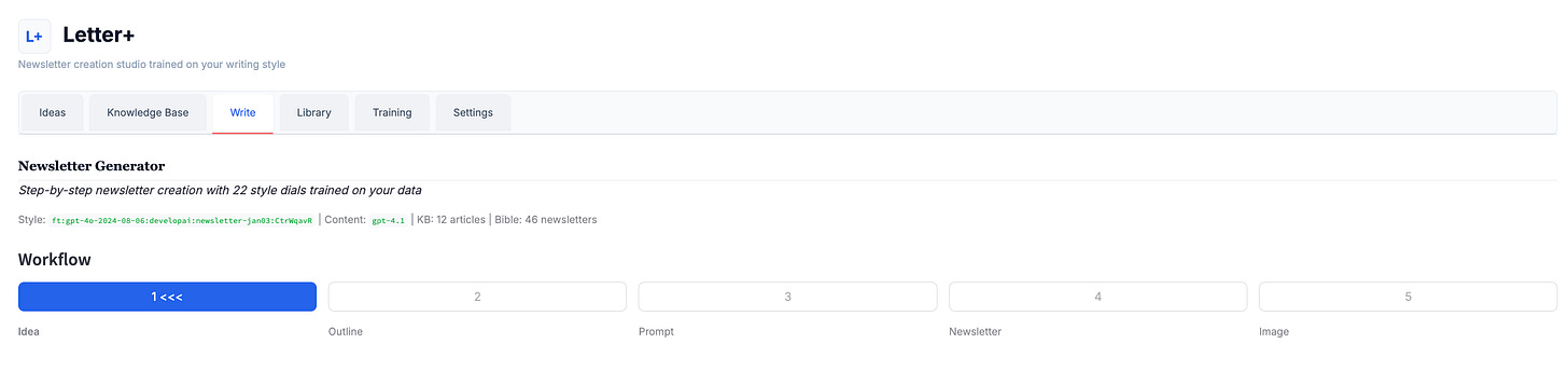 So, I abandoned the fine-tuned model and instead inserted a prompt writing step into my workflow. The sycophantic AI praised me for my creative work around. This pulled everything from the outline into a set of instructions that in turn creates the letter. I also introduced a set of 20 style “dials” based on themes that did well in past letters. So you could adjust how much “doom” or “African influence” appeared in the final letter.